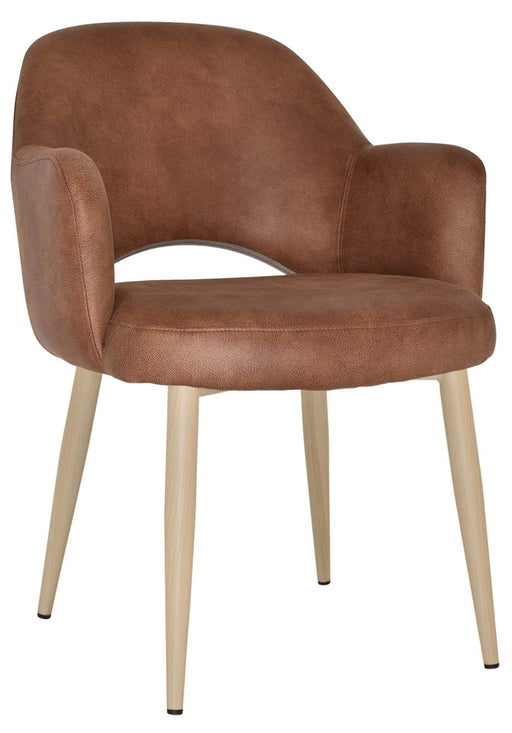 The Albury Arm Chair features a fully upholstered shell with a high density foam seat on a 4 leg trestle powder coated frame with swivel. Produc...