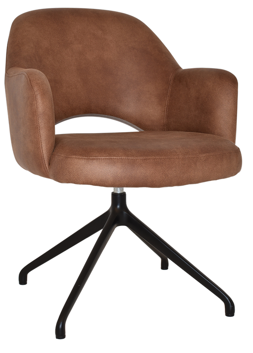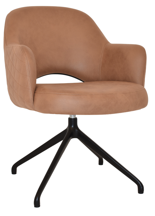 The Albury Arm Chair features a fully upholstered shell with a high density foam seat on a 4 leg trestle powder coated frame with swivel. Produc...